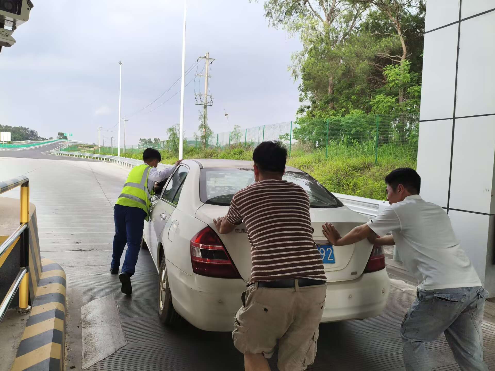 6月14日15時許,在林橫高速洋橋收費站,一輛小轎車在下高速時因發(fā)動機故障滯留在車道中并伴有白煙冒出,因事發(fā)時正逢暴雨,情況險急。當班收費員周秋吉、吳星煒察覺異常后第一時間上報監(jiān)控中心并開啟備用車道,迅速引導后方車流安全有序轉移,同時取用滅火器隨時準備應對突發(fā)情況。在確認車輛無法啟動且白煙仍在持續(xù)冒出時,收費員冒雨協(xié)同司乘將車輛推離車道,轉移至收費站外廣場安全地帶停放,并幫助司乘聯系拖車,暖心服務讓司乘連連“點贊”。